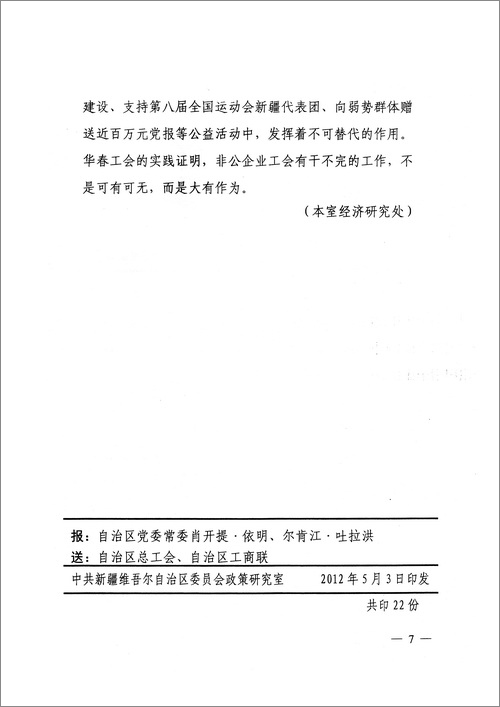 自治區黨委專報——高度肯定華春工會的成功經驗