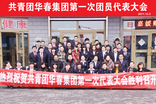 共青團華春集團第一次代表大會于2011年12月3日在恒潤公司培訓室勝利召開,大會由胡梅同志主持,此次會議正式代表、領導及嘉賓共計60余人出席會議,高新區(新市區)團委副書記張新平同志、集團黨委書記嚴天利同志、集團黨委統戰部部長兼機關黨支部書記秦維華同志、華春毛紡黨支部書記郭鵬宏同志、恒潤公司黨支部書記孫業傳同志、華春商貿公司黨支部書記孫佳梅同志、團支部書記李卓軒同志出席大會開閉幕式。