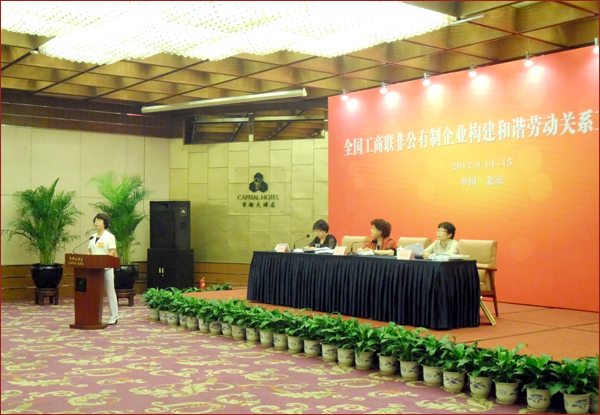 為進一步貫徹落實中央16號文件精神、推動非公有制企業構建和諧勞動關系,由全國工商聯主辦的、由中央統戰部、國務院法制辦、人力資源和社會保障部、全國總工會、中國勞動保障科學研究院等有關單位負責同志和各省級工商聯與全國非公有制企業代表140余人參加的全國非公企業構建和諧勞動關系座談會,于8月14-15日在北京隆重召開。來自中國西部邊陲的新疆華春投資集團的工會主席高青,代表李成功總裁作了大會典型發言,在大會中引起強烈反響,受到高度肯定。